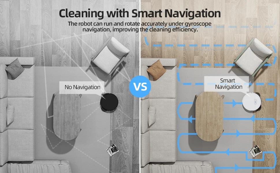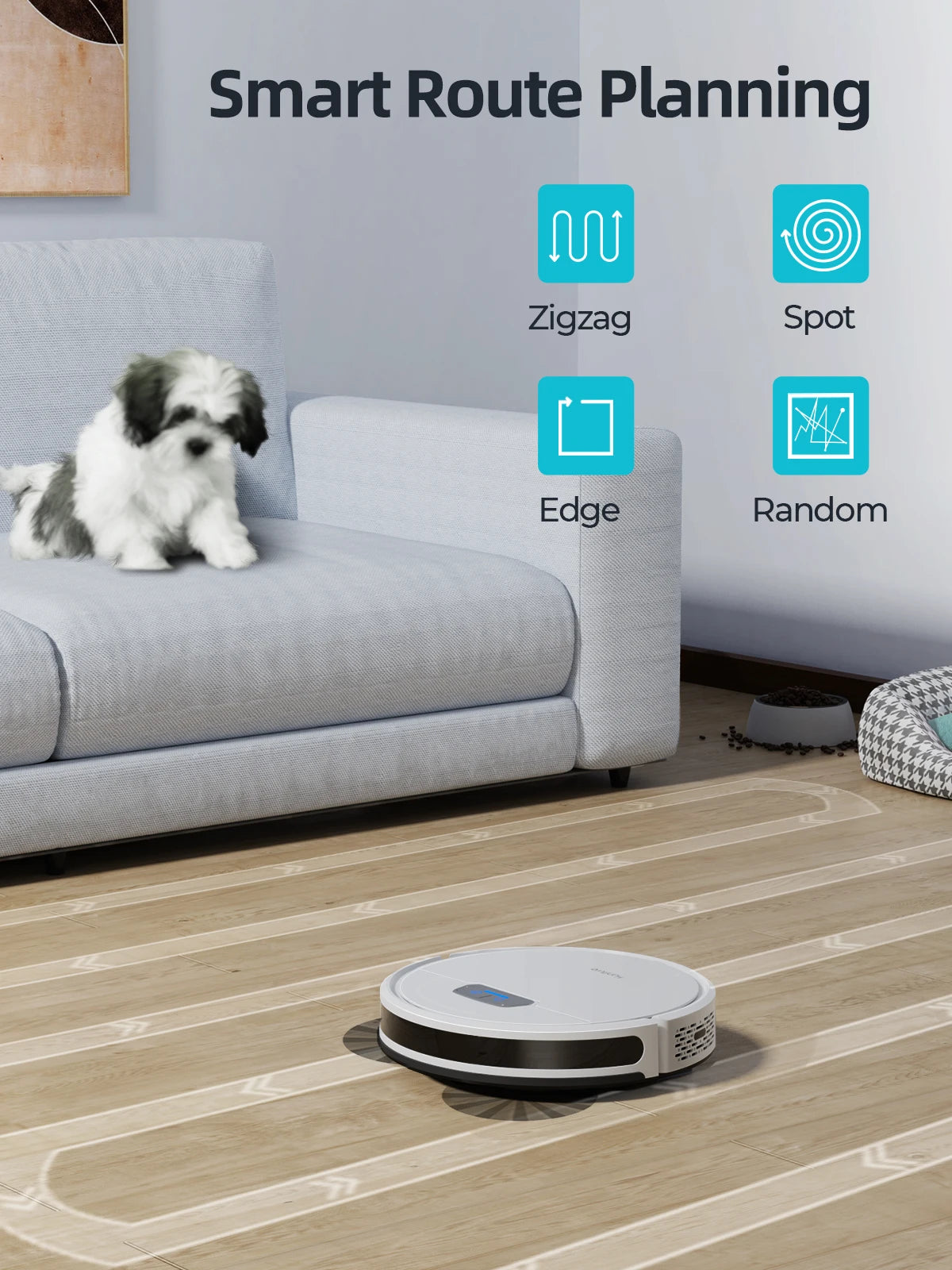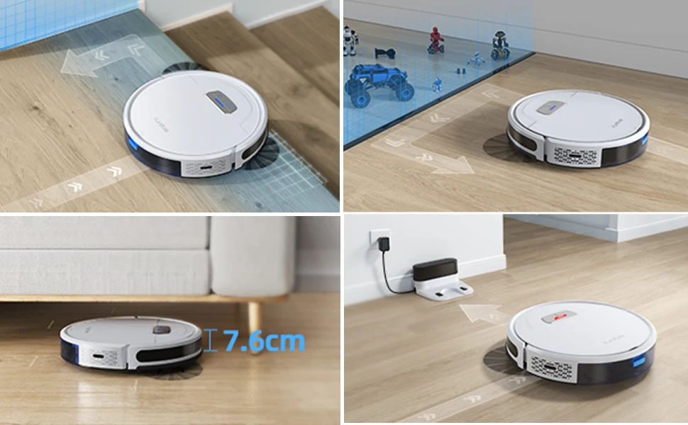【Intelligente Gyroskop Navigation】Er verfügt über ein intelligentes Navigationssystem, das ihm ermöglicht während dem Reinigunsvorgangs automatisch die Umgebung zu scannen und so eine eigene virtuelle Karte erstellt. Gleichzeitig gibt es vier Reinigungsmodi (Zickzack, Punkt, Kante und Zufall) und somit erreicht die Reinigungeffizienz mehr als 85%. Dank dem eingebauten Gefahrenerkennungssystem, kann der Roboter problemlos Hindernisse erkennen und zum Beispiel Stürze von Treppen vorbeugen.